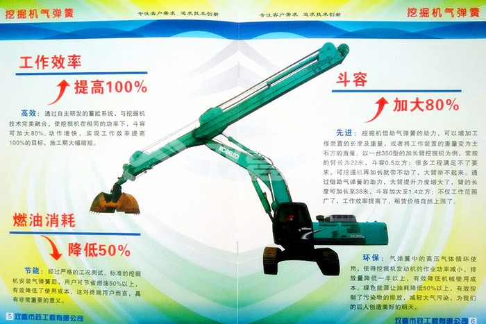 環(huán)保:氣彈簧中的高壓氣體循環(huán)使用,使得挖掘機發(fā)動(dòng)機的作業(yè)功率減小,排放量降低一半以上,有效降低機械使用成本。綠色能源讓油耗降低50%以上,有效控制了污染物的排放,減輕大氣污染,為我們的后人創(chuàng )造美好的明天。